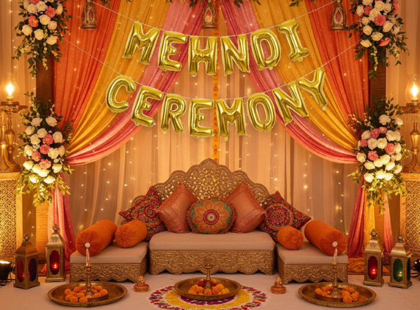 Add vibrant colors and traditional charm to your mehendi ceremony with beautiful floral backdrops, colorful drapes, seating arrangements and ethnic décor themes.